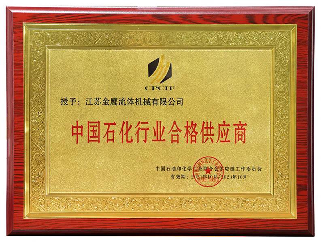江蘇金鷹流體機械有限公司榮獲了由中國石油和化學工業聯合會供應商鏈工作委員會頒布的《中國石化行業合格供應商》證。